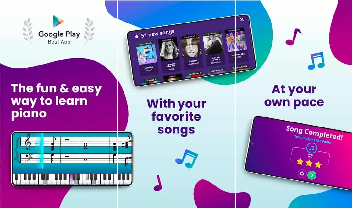 ชื่อง่ายๆ ว่า Piano แอปนี้เหมาะสำหรับการเรียนรู้การเล่นเปียโนเป็นเพลงยอดนิยม ปัจจุบันมีบทเรียนเปียโนในเพลงฮิตมากกว่า 1,000 เพลง โดยมีเพลงใหม่เพิ่มทุกวัน สวัสดีโดย Adele, Stitches โดย Shawn Mendes, Let It Go – Disney’s Frozen, Chandelier by Sia, Despacito โดย Luis Fonsi และ Love Yourself โดย Justin Bieber เป็นเพียงชื่อบางส่วนเท่านั้น