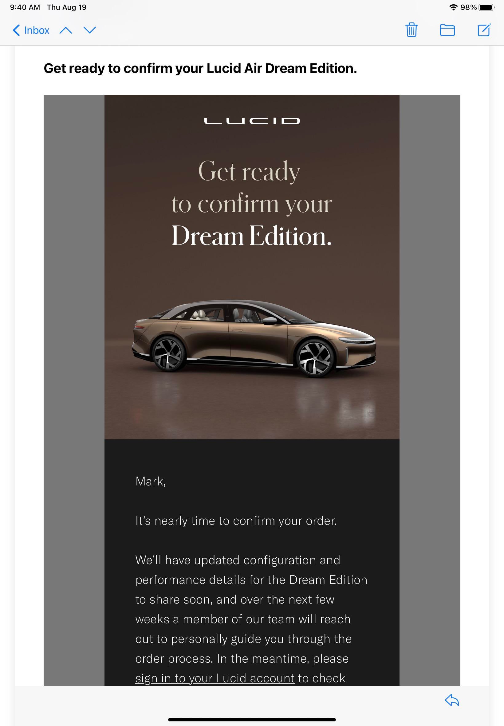 Isso nos leva ao cerne da questão. Agora, dois desenvolvimentos principais sugerem que este desenvolvimento seminal pode finalmente estar próximo. De acordo com várias postagens no Reddit , o Lucid Group agora está enviando e-mails para clientes que reservaram o Lucid Air Dream Edition para confirmar suas reservas: