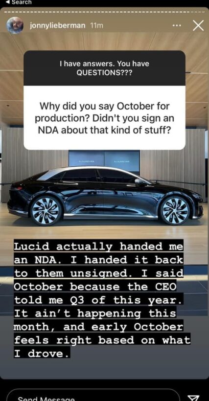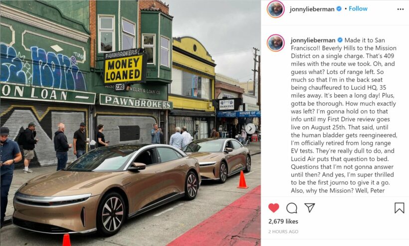 No entanto, o sinal mais claro ainda veio no fim de semana, cortesia do Sr. Jonny Lieberman da MotorTrend, que foi convidado pelo Lucid Group para um test drive o Air EV. Lieberman dirigiu o veículo 409 milhas com uma única carga até São Francisco, e sua avaliação do First Drive entrará no ar no dia 25 de agosto. Crucialmente, ao responder às perguntas dos internautas, Jonny Lieberman indicou no Instagram que a empresa poderia começar a entregar os EVs Lucid Air em outubro de 2021: