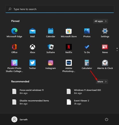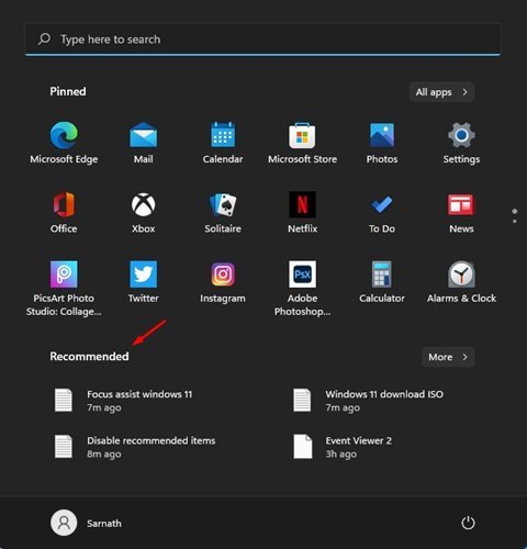 Além disso, o novo menu Iniciar do Windows 11 tem uma seção ‘Recomendado’ que exibe os aplicativos mais usados e relevantes. No entanto, o problema com a recomendação do menu Iniciar é que ela mostra os arquivos criados recentemente na seção Recomendado.