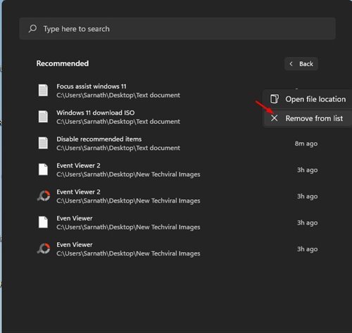 Etapa 3. Agora você verá uma lista de documentos usados recentemente e outros itens. Basta clicar com o botão direito no item que deseja remover e selecionar a opção ‘Remover da lista’.