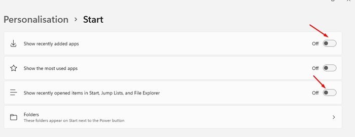 Etapa 6. Na página de personalização do Menu Iniciar, desligue a opção ‘Mostrar aplicativos adicionados recentemente’ e ‘Mostrar itens abertos recentemente em Iniciar, Lista de Atalhos e Explorador de Arquivos’.