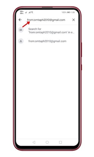 Etapa 3. Na caixa Pesquisar na caixa de correio, digite o seguinte de: [email protegido] (Substitua o [email protegido] com o endereço de e-mail pelo qual deseja classificar os e-mails) . Quando terminar, toque no botão Enter.
