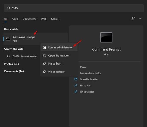 Etapa 1. Primeiro de tudo, abra a pesquisa do Windows e digite CMD. Em seguida, clique com o botão direito do mouse em ‘CMD’ e selecione ‘Executar como administrador.’