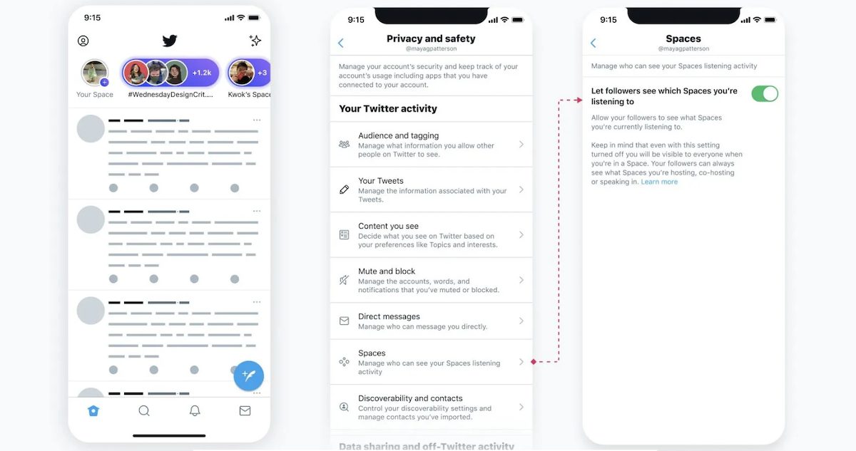 @TwitterSpaces anunciou a nova opção para permitir que os seguidores dos usuários vejam quais Espaços eles estão ouvindo. Atualmente, em teste, todos os Espaços das pessoas que os usuários estão seguindo aparecerão no topo de sua linha do tempo. E os usuários preocupados com a privacidade podem desativar o recurso nas configurações de privacidade e segurança do aplicativo para ocultar o espaço que estão ouvindo de outras pessoas.