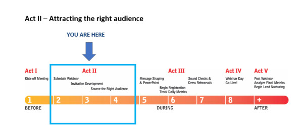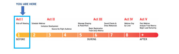 Como em qualquer evento bem produzido, o sucesso começa com o planejamento. Para um webinar de geração de demanda, deve levar cerca de seis a oito semanas desde o momento em que você diz”vamos lá”até o horário de exibição. Agora, vamos continuar com este show e os cinco atos de um webinar de sucesso.