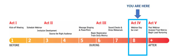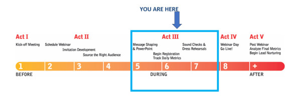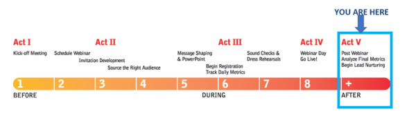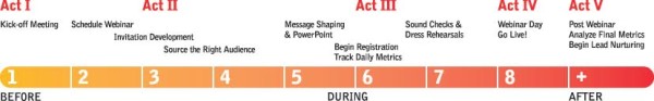 A cola que mantém tudo isso unido é uma metodologia de gerenciamento de projetos orientada a prazos, um conjunto das melhores práticas e o uso de e-mail e métricas de webinar para avaliar o desempenho em todo o ciclo de vida do webinar. Os objetivos de cada ato e a lista de verificação de tarefas oferecem uma base sólida para uma metodologia de sucesso.