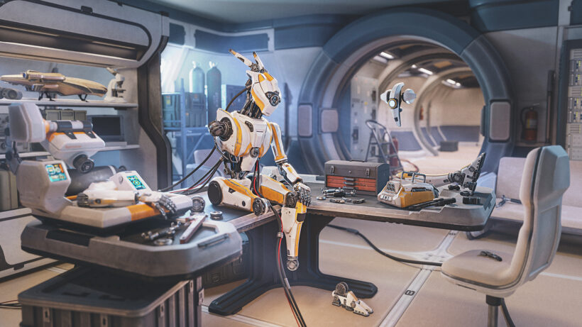 A cena de teste é uma oficina de conserto de robôs. O sombreamento do espaço de textura é usado para sombrear a cena conforme a câmera se move ao redor do ambiente.