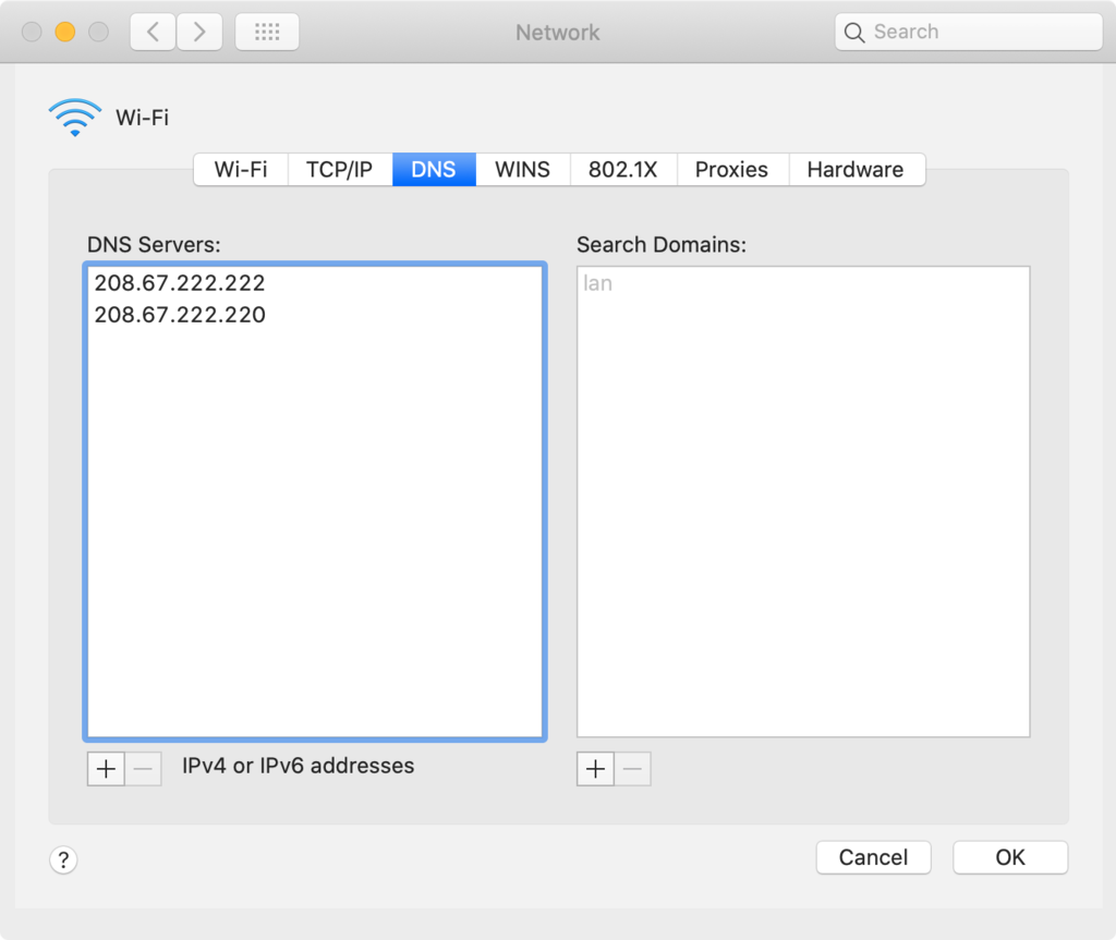 Selecione Rede e escolha a conexão com a Internet que você está usando no momento. Clique no botão Avançado . Em seguida, vá para a guia DNS . Pressione o botão + e digite o novo servidor DNS-Google Public DNS ou OpenDNS, listados acima.