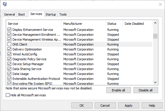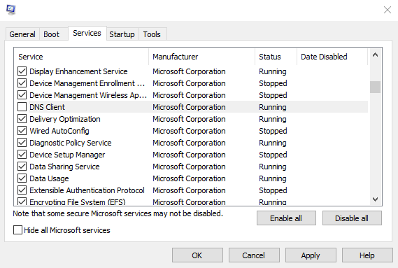 Pressione as teclas Win + R em seu teclado e digite msconfig na barra de pesquisa Selecione os Serviços guia, role para baixo e encontre a opção Cliente DNS Desmarque a caixa para desativá-lo