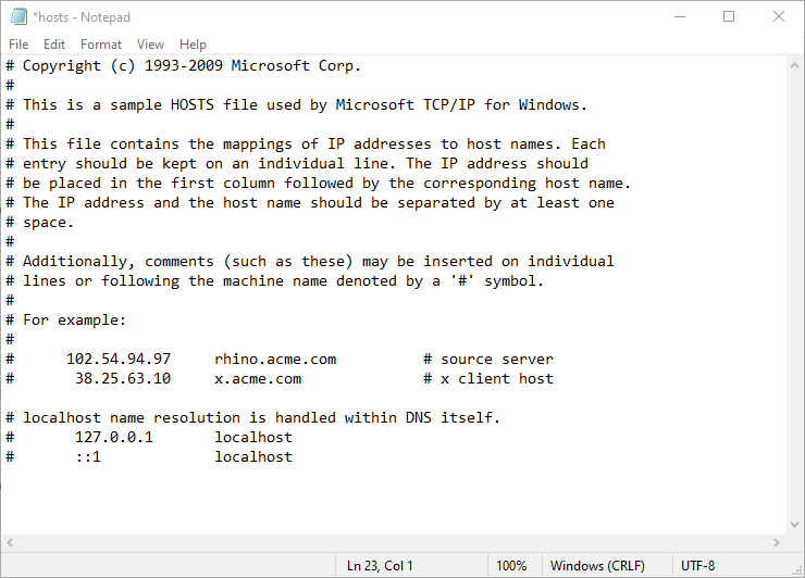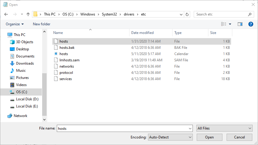 Digite Notepad na barra de pesquisa e selecione Executar como administrador Navegue até Arquivo -> Abrir Altere o filtro de arquivo de Documentos de texto ( *.txt) para Todos os arquivos Copie o seguinte na Barra de endereços :% SystemRoot%: \ Windows \ System32 \ Drivers \ etc Clique duas vezes em hosts file para acessá-lo