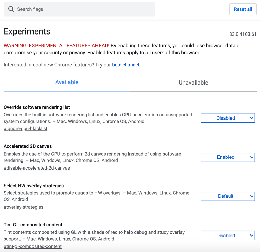 Você terá acesso a todos os recursos experimentais do Chrome disponíveis. Clique no botão Redefinir tudo no canto superior direito. Em seguida, feche e reabra o navegador.