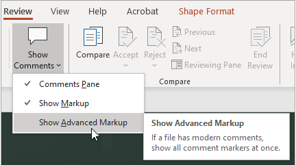 Os comentários modernos não podem ser lidos pelo PowerPoint 2019 ou mais antigo, incluindo assinaturas e versões perpétuas. Os usuários finais serão notificados sobre comentários não suportados em suas apresentações, com um prompt para abrir o arquivo no PowerPoint para a web para revisar os comentários modernos.