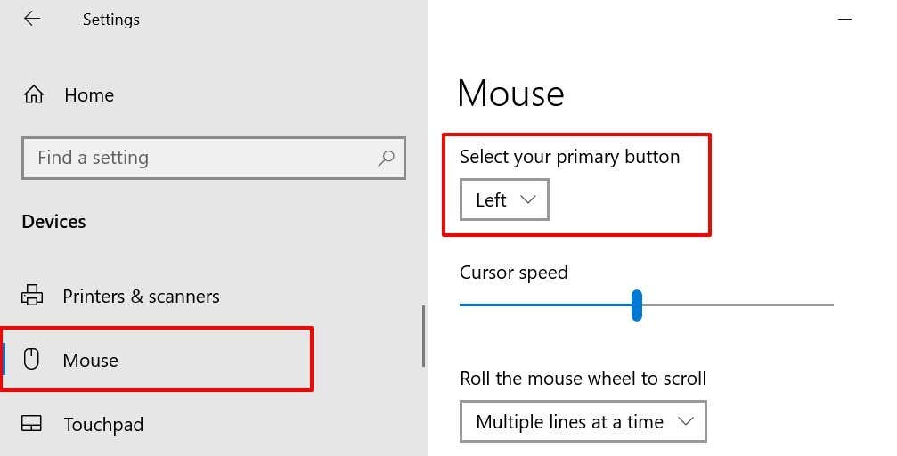 Vá para Configurações > Dispositivos > Mouse e certifique-se de que a opção “Selecione seu botão principal” esteja definida como Esquerda .