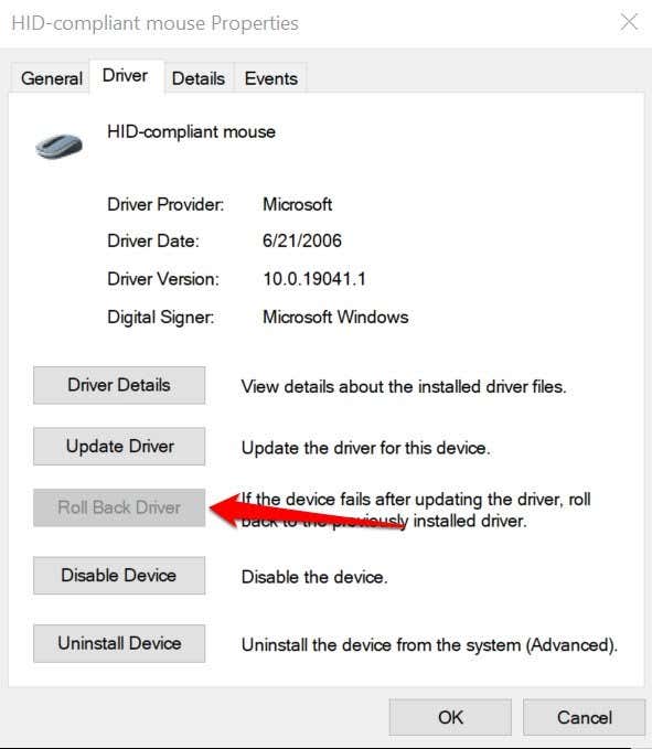 Desinstale e reinstale o driver do mouse se a opção “Reverter driver” está esmaecida.