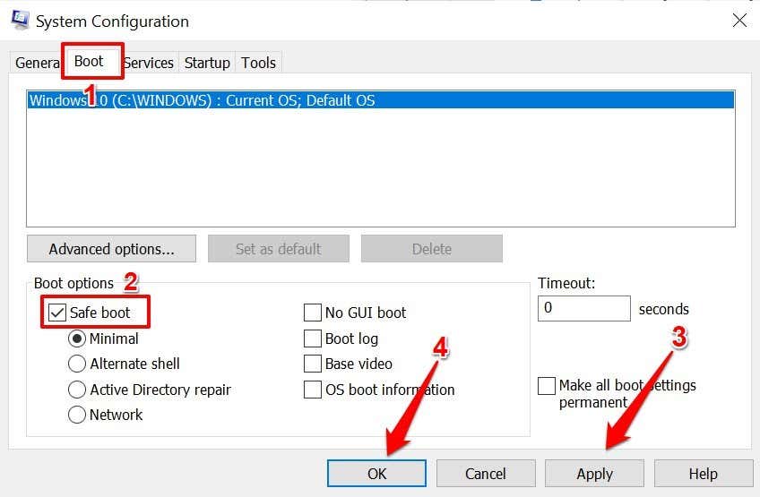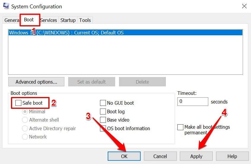 Pressione a tecla Windows, digite msconfig na barra de pesquisa e selecione Executar como administrador para abrir o aplicativo de configuração do sistema . Vá para o Boot , marque a caixa Inicialização segura , selecione Aplicar e selecione OK .