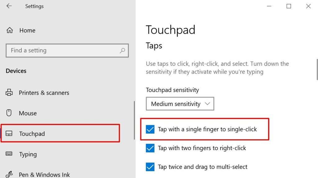 Vá para Configurações > Dispositivos > Touchpad , role até a seção “Toques” e marque a caixa Toque com um único dedo para clicar uma vez .