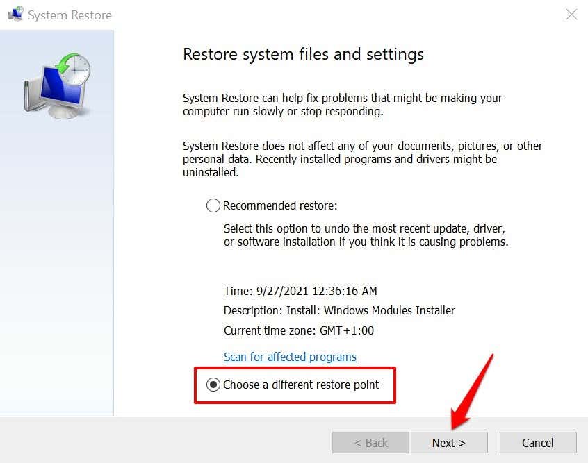 Digite restaurar na caixa de Pesquisa do Windows e selecione Criar um ponto de restauração Vá para Proteção do Sistema guia e selecione Restauração do sistema . O Windows recomendará o ponto de restauração mais recente, mas você deve reverter para um ponto de restauração mais antigo que foi criado antes que o clique com o botão esquerdo do seu PC parasse de funcionar. Selecione Escolher um ponto de restauração diferente e selecione Avançar . Selecione o ponto de restauração apropriado e selecione Avançar para prosseguir.