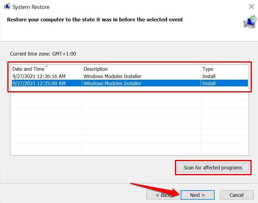 Você pode selecionar Digitalizar para programas afetados para visualizar os aplicativos, drivers e atualizações que serão removidos do seu PC durante o processo de restauração.