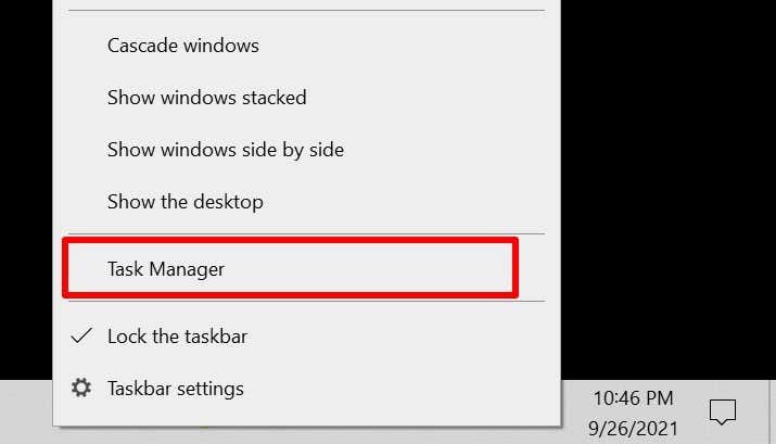 Clique com o botão direito em um espaço em branco na barra de tarefas e selecione Gerenciador de Tarefas .