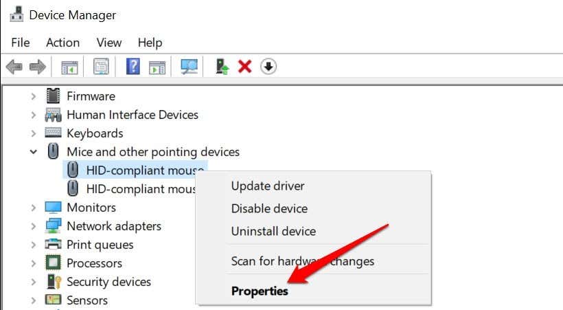 Pressione os botões tecla Windows + X e selecione Gerenciador de dispositivos . Expanda Ratos e outros dispositivos apontadores categoria, clique com o botão direito ou mantenha pressionado o driver do mouse e selecione Propriedades . Vá para a guia Driver e selecione Atualizar driver para verificar seu dispositivo, a Internet ou os downloads de atualizações do Windows para novas versões de driver.