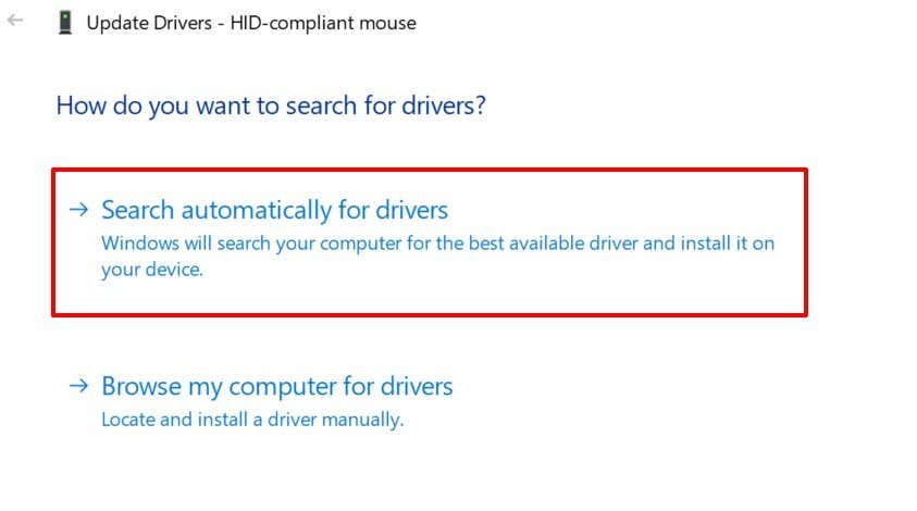 Selecione Pesquisar automaticamente por drivers na próxima página e siga o prompt para atualizar o driver do mouse.