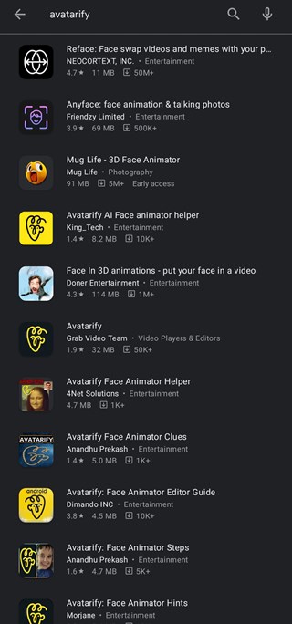 Como você pode ver na captura de tela acima, a Play Store tem um monte de aplicativos não oficiais-alguns que nem mesmo funcionam-com o ícone Avatarify.