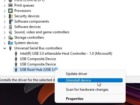 5. Da mesma forma, vá para “USB Root Hub (USB 3.0)” e desinstale-o.
