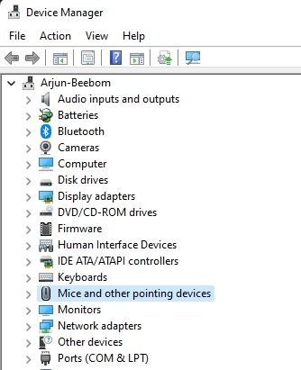 2. Em Gerenciador de dispositivos, use as teclas Tab e setas para alternar entre as opções. Vá para “Ratos e outros dispositivos apontadores” e pressione a tecla de seta para a direita para expandir o menu.