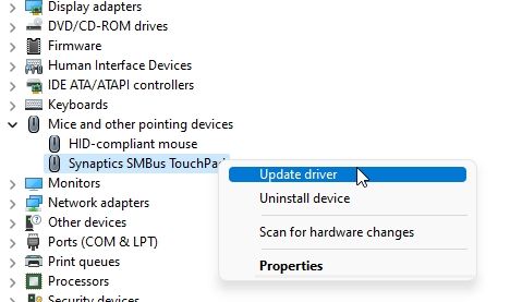 2. Em seguida, expanda a seção “Ratos e outros dispositivos apontadores”. Aqui, dependendo do seu mouse (mouse compatível com HID) ou touchpad (dispositivo de entrada ou Touchpad), abra o menu de contexto e selecione a opção “Atualizar driver”.
