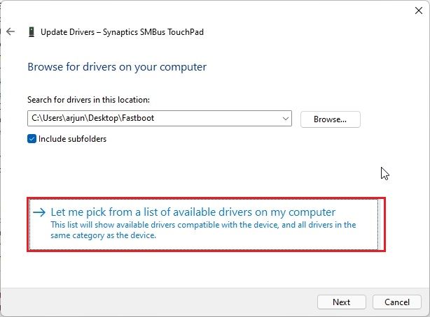 4. Depois disso, pressione”Tab”novamente e vá para”Deixe-me escolher em uma lista de drivers disponíveis no meu computador“. Agora, pressione Enter.