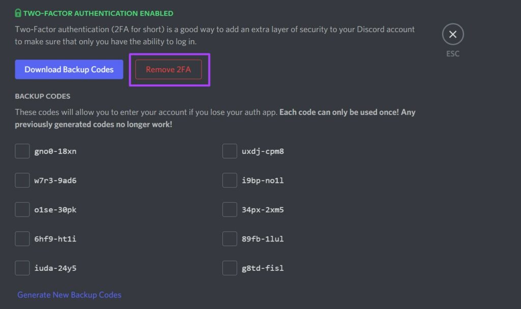 Certas situações garantem que você desative o 2FA temporariamente. Talvez você preveja que seu telefone ficará indisponível por um período. Se você se encontrar nessa situação, siga as etapas abaixo para desativar a autenticação de dois fatores no Discord: