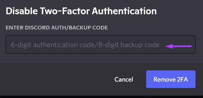 Etapa 5: > Digite o código Discord Auth do aplicativo autenticador. Como alternativa, você pode inserir seu código de backup do Discord.