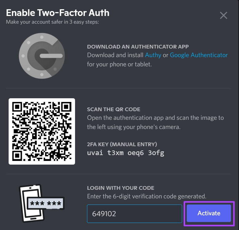 Etapa 9: insira o código exibido em seu aplicativo autenticador para Discord e clique em Ativar. A 2FA fica ativa assim que o aplicativo aceita os códigos.