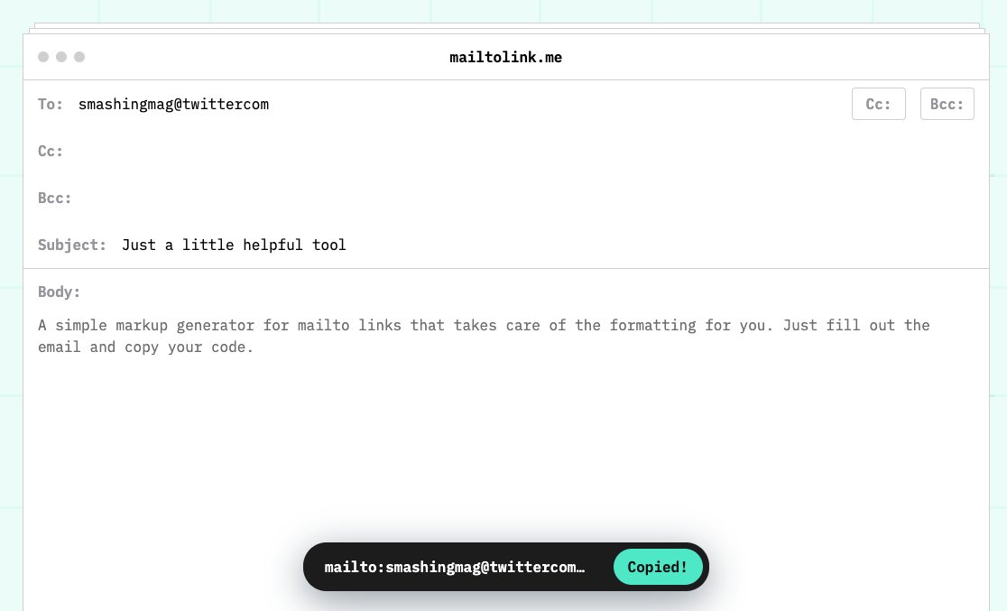 Os bons e velhos links HTML podem fazer mais do que normalmente acreditamos. Podemos estar acostumados com o prefixo mailto: , mas na verdade gerar o código pode ser muito chato. Mailtolink.me faz uma coisa, e faz bem: gera o snippet para os links mailto incluindo CC, BCC, linha de assunto e corpo do texto.