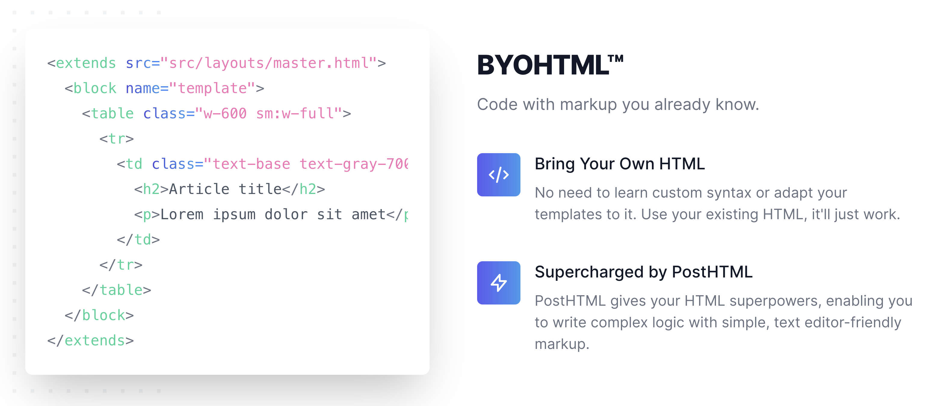 Fazer um e-mail em HTML funcionar em clientes de e-mail não é uma tarefa fácil. Felizmente, existem muitas ferramentas, modelos e estruturas confiáveis para facilitar a realização de seu trabalho. Por exemplo, Maizzle é uma estrutura que ajuda você a criar e-mails em HTML rapidamente com CSS do Tailwind e pós-processamento específico para e-mail . Ele também fornece alguns projetos prontos ( Maizzle Starters ) com os quais você pode começar imediatamente.