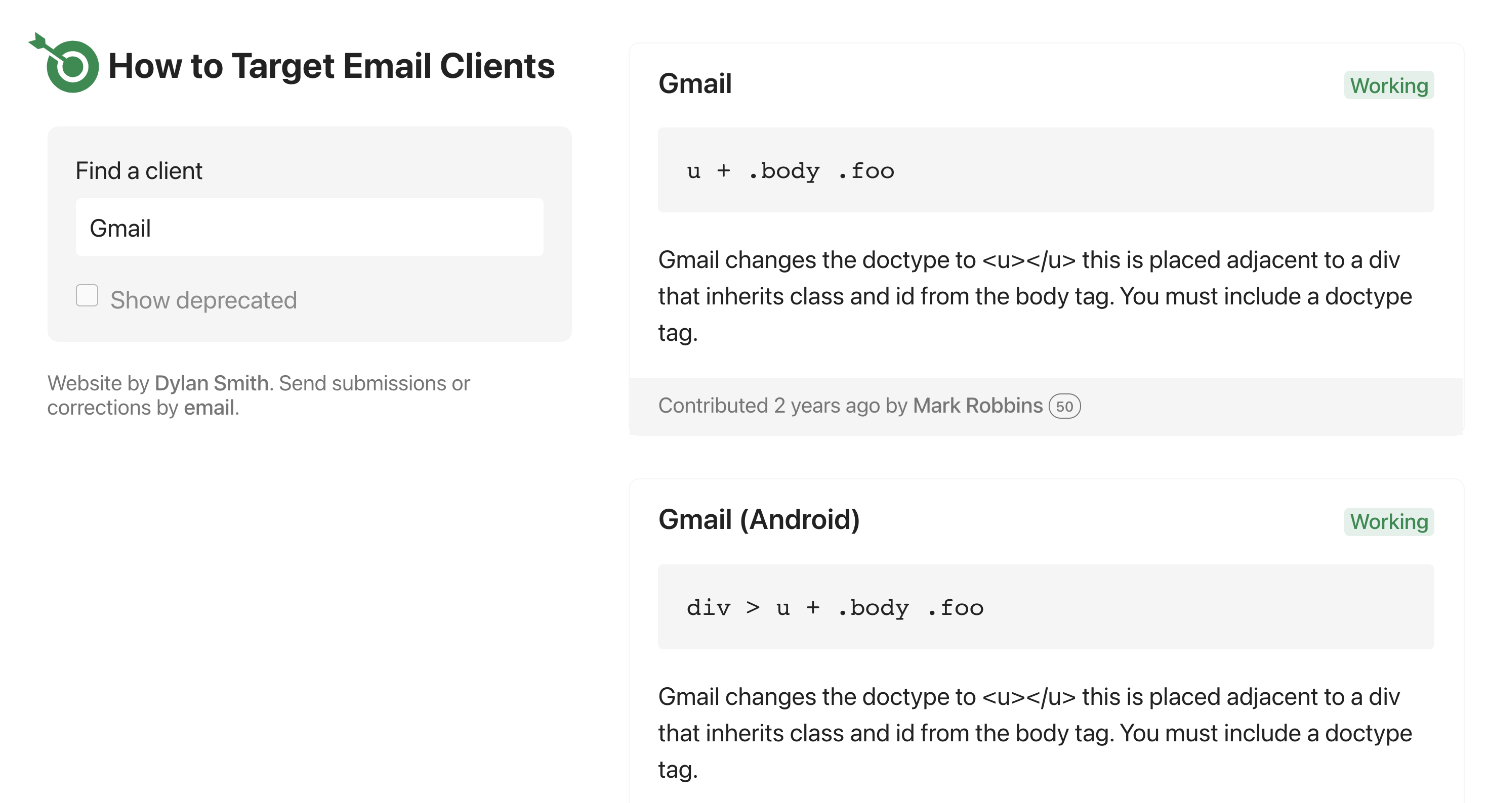 Os clientes de e-mail modificam e removem alguns de seus HTML e CSS, geralmente sem piedade. Se um dos clientes de e-mail não se comportar como esperado, você pode tratá-lo separadamente. Uma cheatsheet para direcionar clientes de e-mail permite que você escolha um cliente de e-mail de destino e pelo menos tente endereçá-lo diretamente. Pode não funcionar o tempo todo, pois os clientes de e-mail mudam o tempo todo, mas é algo que vale a pena tentar.