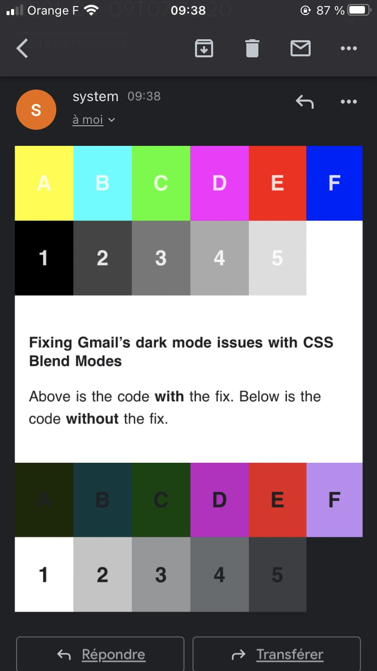 Rémi Parmentier vai um pouco mais fundo, mostrando como corrigir o problema do Gmail problemas de modo com CSS Blend Modes . O Gmail impõe a mudança de qualquer cor de texto clara para uma cor escura. Se você precisar consertá-lo, Rémi criou um uso criativo do mix-blend-mode (compatível com o Gmail) para manter a cor clara do texto, se necessário. E se você precisar garantir que seus e-mails respondam ao modo escuro do Outlook.com , Remi está coberto também.