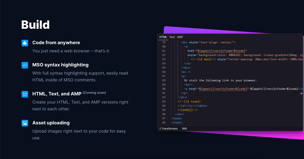 Se você gasta muito tempo com e-mail em HTML, pode usar um editor de e-mail em HTML dedicado. Parcel é exatamente isso: um editor de código construído especificamente para codificar e projetar e-mails. Ele fornece visualizações ao vivo, para que você possa ver em tempo real o que está construindo, e também possui recursos de acessibilidade prontos para uso, para que você possa verificar problemas de acessibilidade enquanto constrói ou projeta o e-mail. Além disso, a ferramenta também permite que você colabore com sua equipe e execute testes de e-mail diretamente da ferramenta.