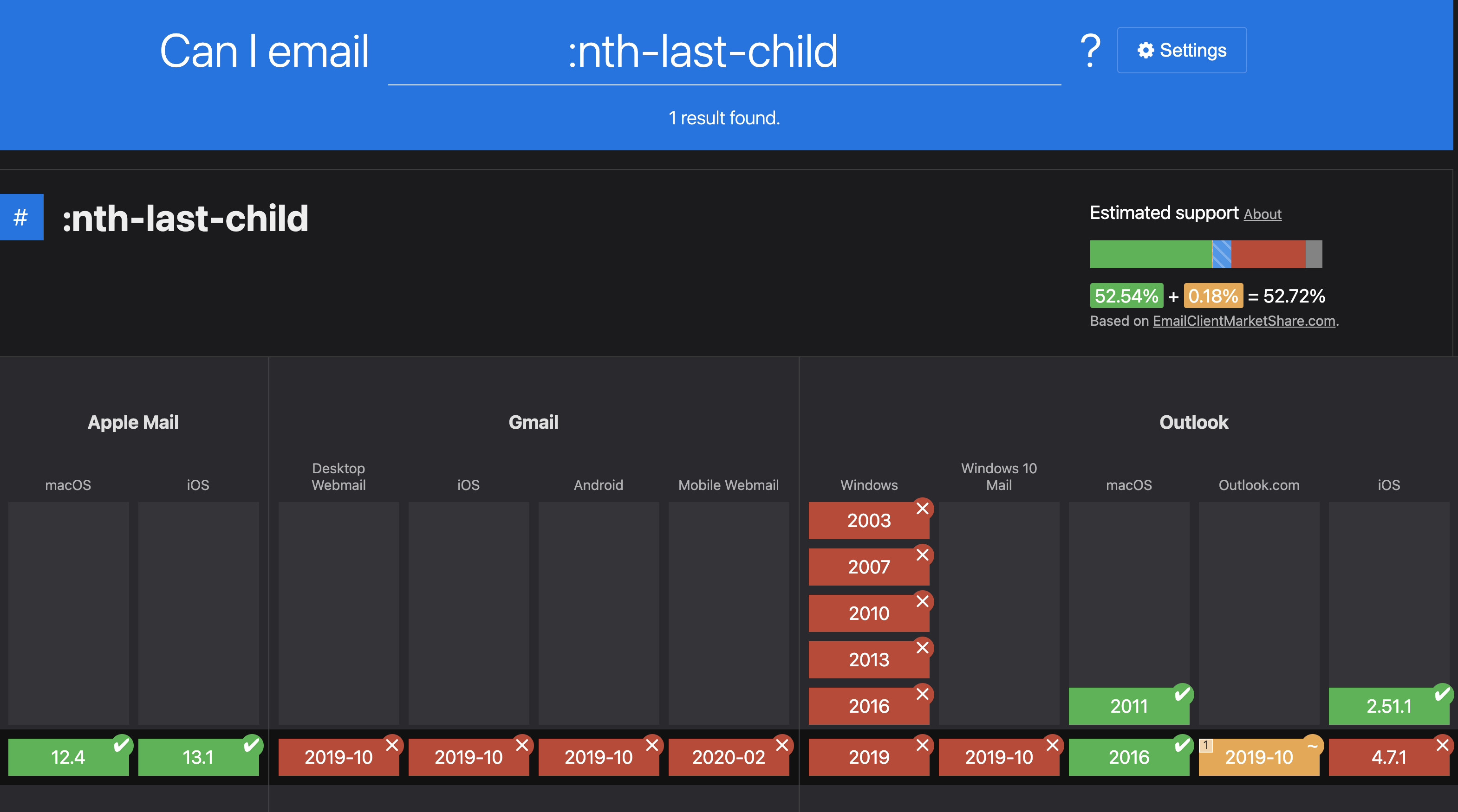 Uma ferramenta útil que pertence ao conjunto de ferramentas de todos que se encontram em conflito com e-mails em HTML-seja de vez em quando ou regularmente-é caniemail.com . Inspirado no conceito de sucesso de caniuse.com , Can I email permite que você verifique o suporte para 179 recursos HTML e CSS em 31 clientes de e-mail.