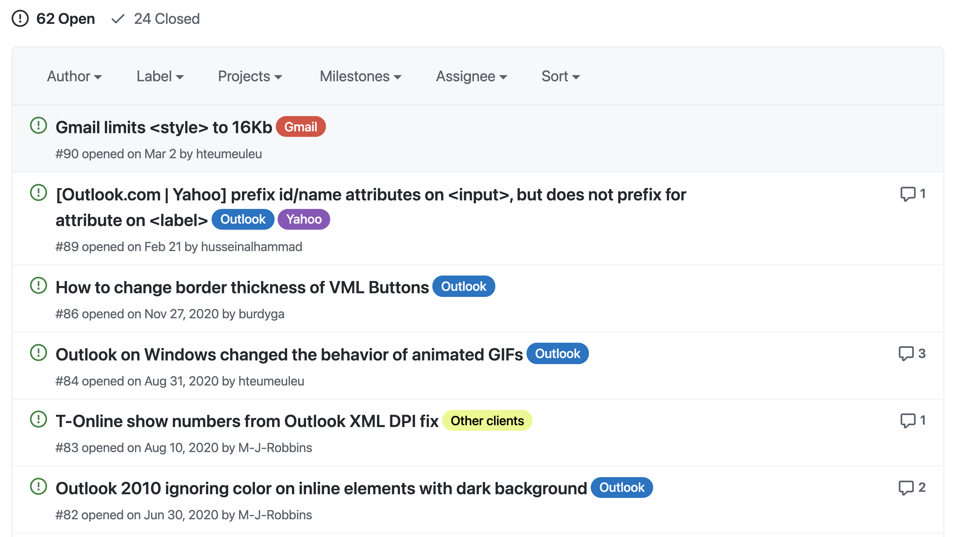 Para ajudá-lo a entender o que está acontecendo quando você encontra bugs como esses, Rémi Parmentier mantém Bugs por e-mail , um GitHub repositório para comportamentos estranhos do cliente de e-mail . Ele não apenas torna a vida dos designers de e-mail mais fácil, fornecendo um local para discutir bugs, mas também tenta relatar cada bug à empresa em questão e corrigi-los para sempre. Mas, caso não seja possível, Como direcionar clientes de email fornece uma visão geral das soluções alternativas para direcionar clientes de email específicos.