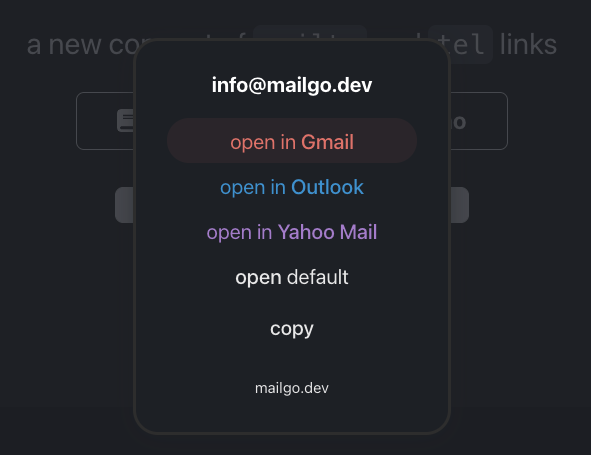 Em vez de abrir um cliente de e-mail nativo, ambas as ferramentas exibem uma janela modal , permitindo ao usuário escolher um dos serviços preferidos ou copiar e colar o link. Além disso, o Mailgo pode endereçar todos os links tel , permitindo que eles abram o Telegram, WhatsApp, Skype, façam chamadas como padrão ou copiem o número do telefone-e também suporta o modo escuro.