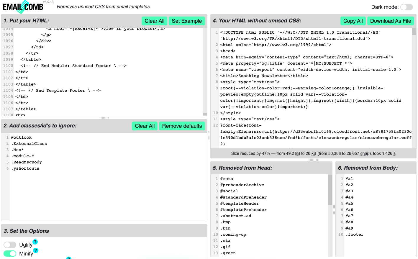 Escrever CSS não é uma tarefa particularmente empolgante com e-mail em HTML, espalhado por ! important e estilos inline por todo o lugar. Para remover CSS não utilizado dos modelos de e-mail, existe o Email Comb . A ferramenta permite que você adicione classes e IDs que deseja ignorar, escolha se deseja minimizá-los e remover comentários, e mostra exatamente o que foi removido.