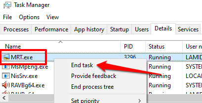 Às vezes, uma falha temporária do sistema pode fazer com que a ferramenta de remoção de software consuma recursos excessivos do sistema. Clique com o botão direito do mouse em MRT.exe no Gerenciador de tarefas e selecione Finalizar tarefa .