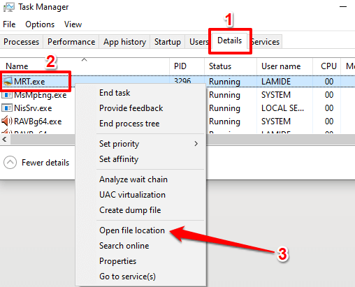 2. Vá para a guia Detalhes , clique com o botão direito em MRT.exe e selecione Abrir local do arquivo no menu de contexto.