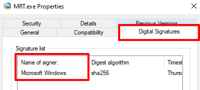 Examinar a assinatura digital do MRT.exe também é uma maneira eficaz de detectar se você possui ou não uma cópia original do arquivo. Clique com o botão direito em MRT.exe no Explorador de Arquivos ou Gerenciador de Tarefas e selecione Propriedades .