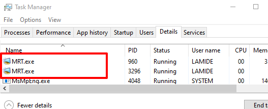 Observação: é possível encontrar várias instâncias de MRT.exe no Gerenciador de tarefas. Se for esse o caso do seu PC, certifique-se de verificar o local do arquivo e a assinatura digital para cada ocorrência.