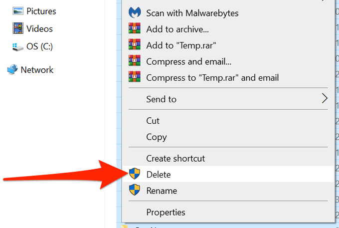 - Clique com o botão direito em qualquer arquivo e selecione Excluir . Isso exclui todos os seus arquivos temporários.