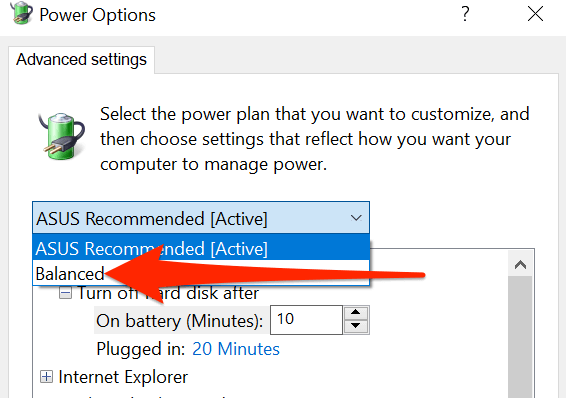 7. Clique no menu suspenso na parte superior e percorra as outras opções com uma reinicialização do PC entre cada seleção. Por exemplo, se este menu tiver Equilibrado como a seleção atual, altere-o para uma das outras opções disponíveis. Selecione Aplicar ou OK na parte inferior para salvar suas alterações. Reinicialize o PC.