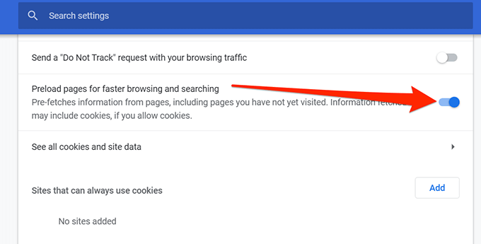 - Role para baixo e desative Pré-carregar páginas para navegação e pesquisa mais rápidas .